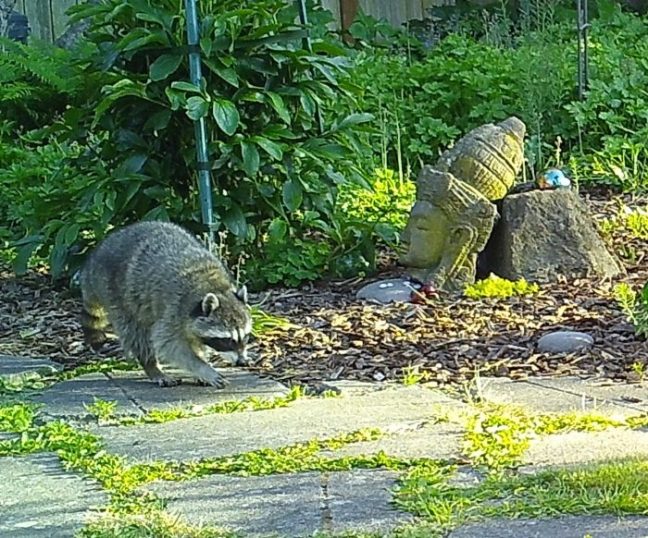 Rocky was unaware of a 2nd security camera protecting the Foggy Bottoms Resort and Spa. It wouldn’t have mattered. He sought a boon from the Goddess Of Perpetual Succour recently renamed from the far less august title of Perpetual Hunger. These long Summer days meant that he couldn’t forage till after the ever later sunsets. Perhaps she could do something about making nightfall sooner. In return he would embellish her shrine with a chicken bone. The Goddess was unlikely to grant a favor on such a weak promise.