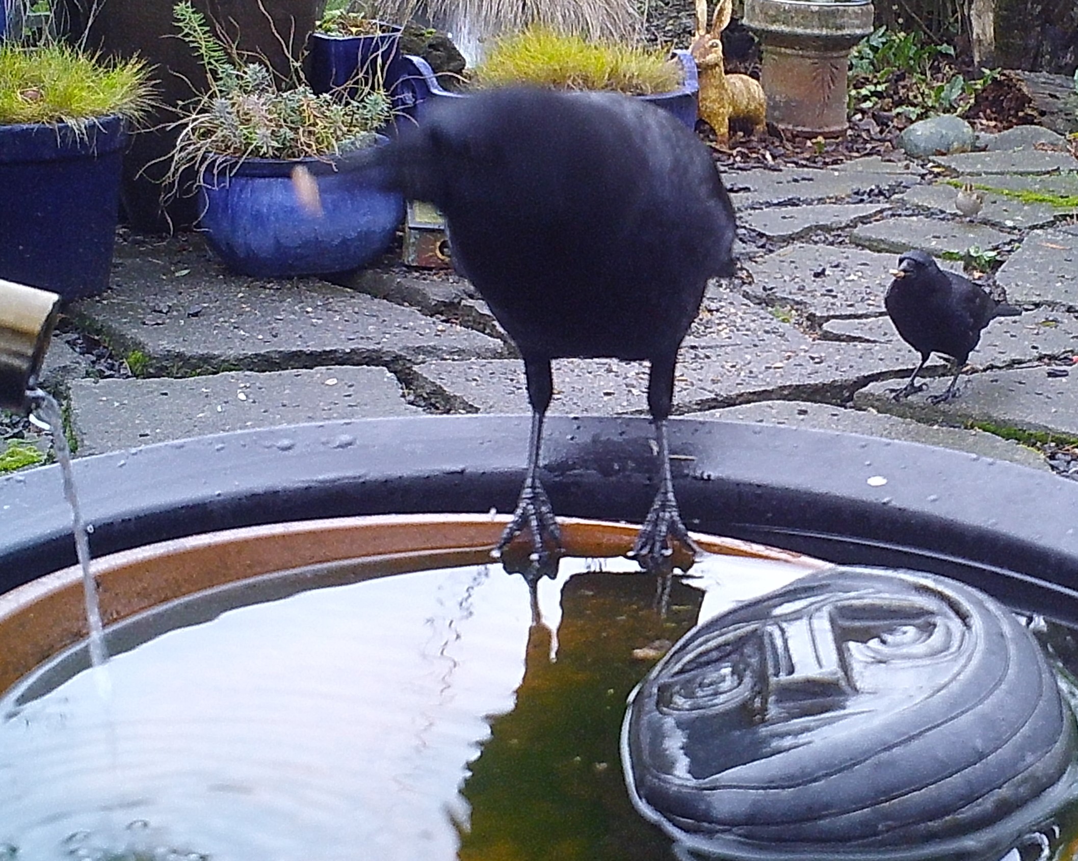 The Crows had mixed feelings about nuts as part of the Christmas cheer served by the kindly ol’ pensioner. Seen above each crow softens his food by soaking in the life giving waters of the Foggy Bottoms Resort and Spa. the Face of Everyman was reluctant to take credit for the selection of foods offered this time of year. He pretended to ignore comments of criticism or praise.