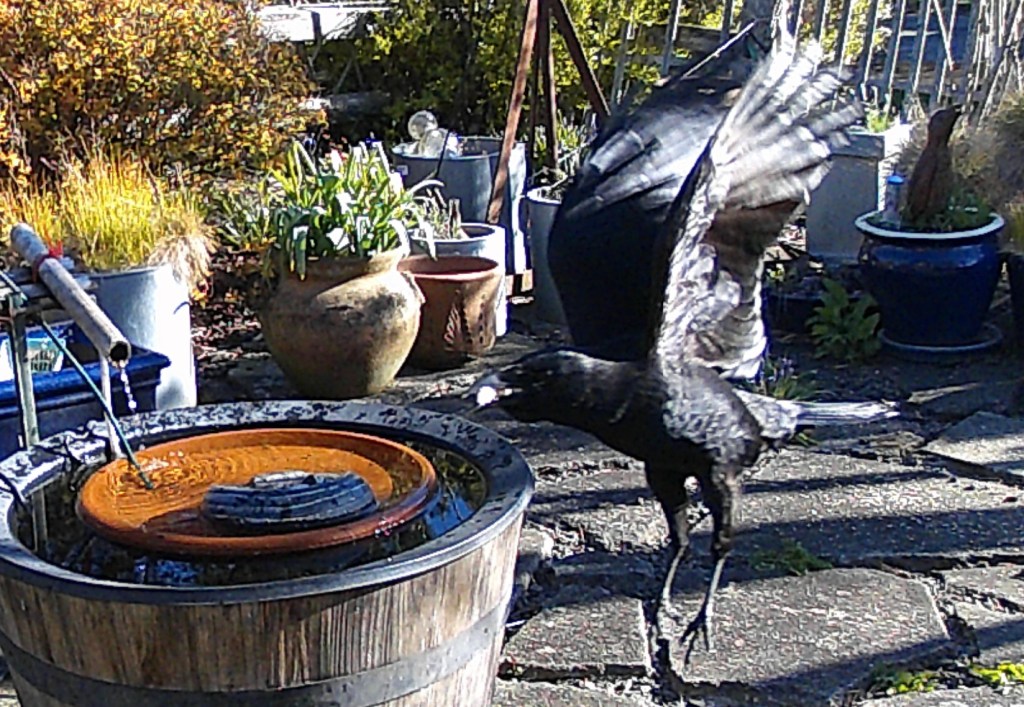 A routine review of alternate security cameras covering the Foggy Bottoms Resort and Spa revealed the blatant theft of an ornamental stone. the Face of Everyman did not let this natural behavior of Crows disturb him; perhaps a more attractive stone would be returned in its stead.