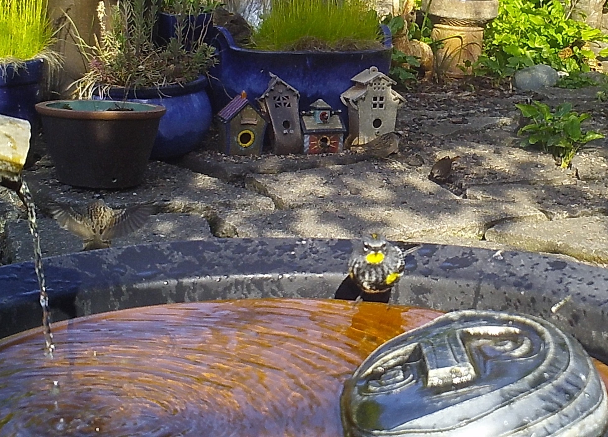 the Face of Everyman was always pleased to greet a new comer. This shy lady was looking for nesting material. The venerable sage was pleased to tell her that the Foggy Bottoms Resort and Spa kept a box of useful feathers, moss, twigs and bits of string behind the Cabana huts. The village garden supply kept mud and spider web on hand, if needed.
