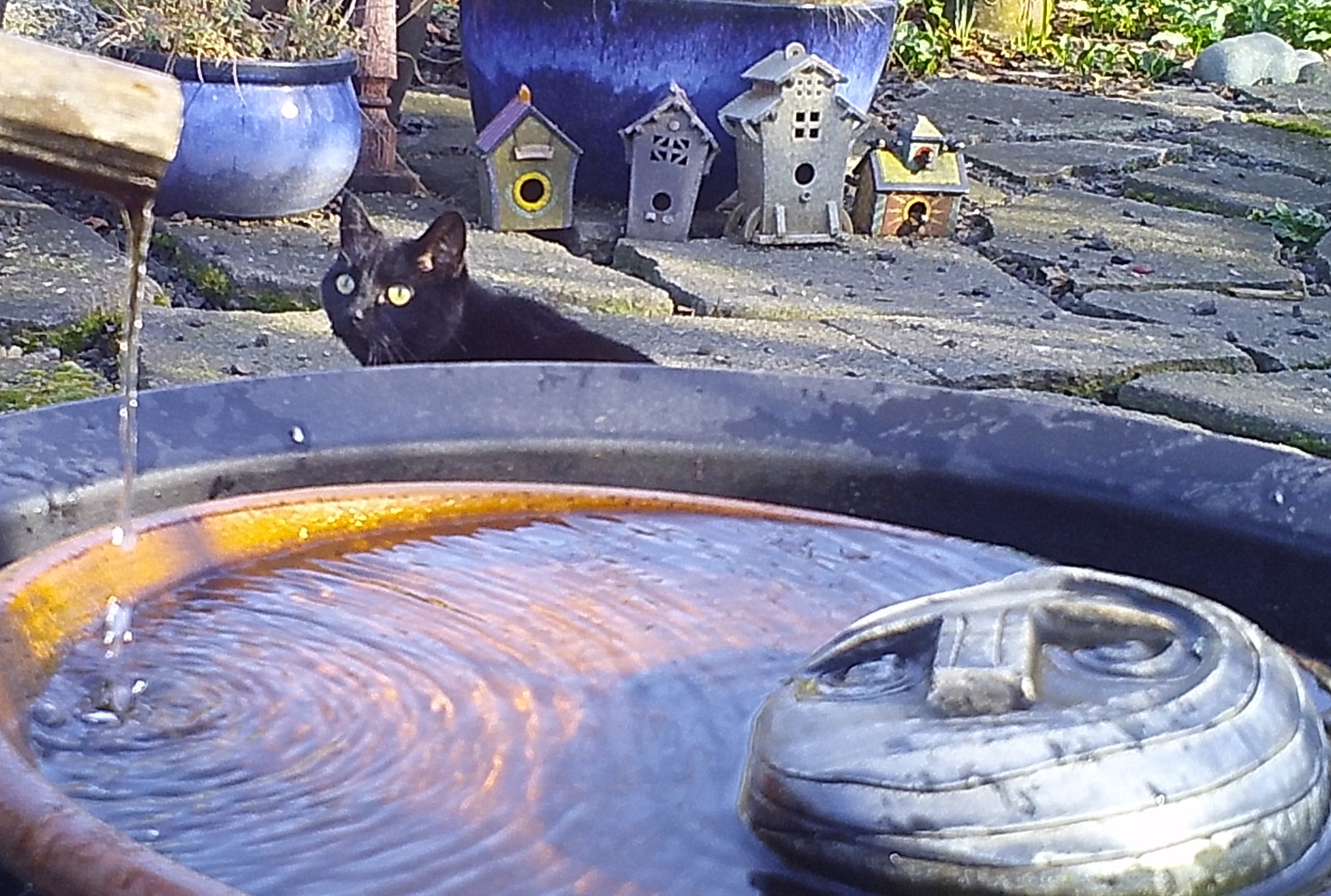 As the Cat became fully mesmerized by the falling waters of the Spring of Perpetual Happiness it’s mind would come under the control of the Face of Everyman. Slowly the venerable sage suggested that the cat leave the Foggy Bottoms Resort and Spa. Somehow such hypnotic techniques were hit and miss.