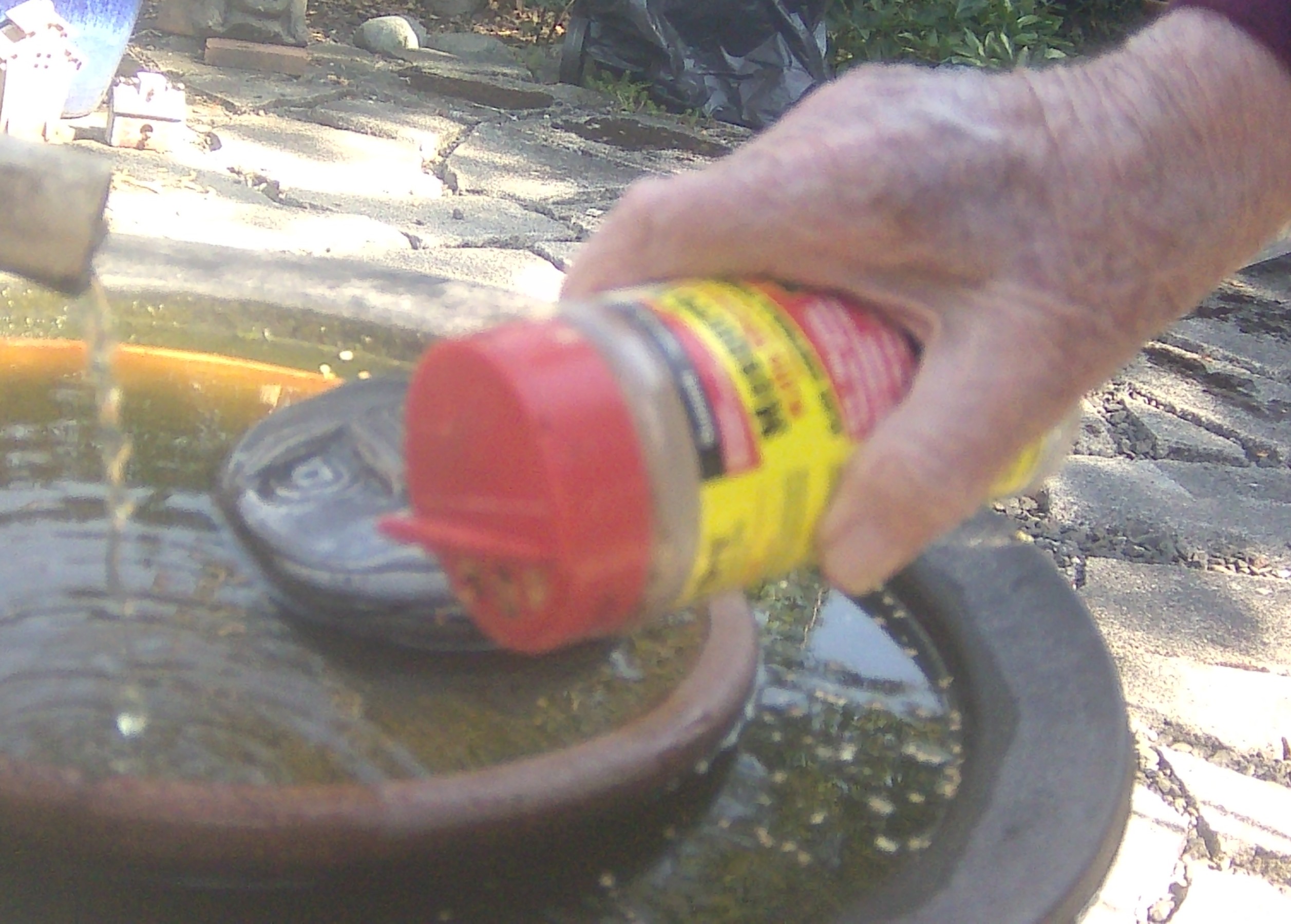 the Face of Everyman wanted to show behind the scenes action with this photo of the kindle ol’ pensioner applying mosquito pellets to the waters of the Foggy Bottoms Resort and Spa. The venerable sage wasn’t sure what this biological agent would do to his near perfect face.
