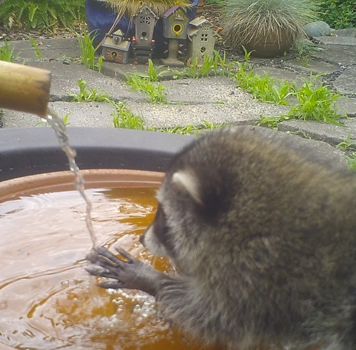 Mom has upset the eco-balance at the Foggy Bottoms Resort and Spa. This morning she set out with all five of her Kits on a sort of meet and greet tour. At this stop Madalynn got to meet the Face of Everyman as well as wash up a bit. Not seen are: Harold, Cletus, Sophie and Yvon. The kindly ol’ pensioner can be sure that the new family will be back; almost nightly. Mom has till September to teach them everything they’ll need to know as adults.