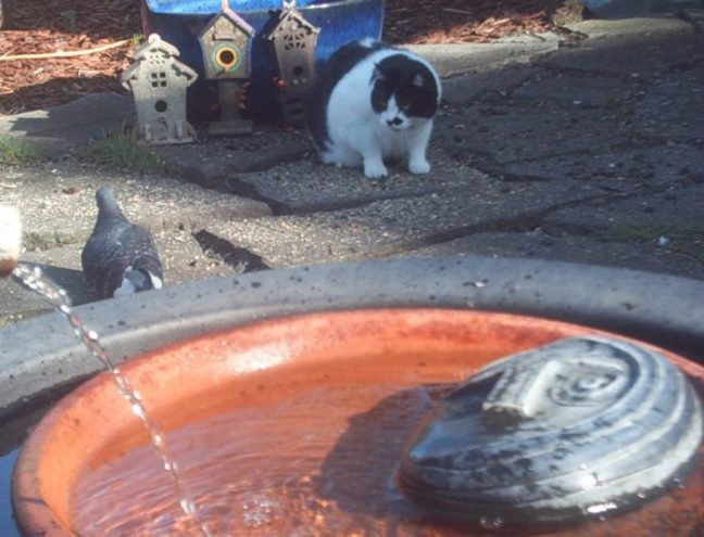 Tula’ the Cat came down from the warmth of the manor house situated high above the Foggy Bottoms Resort and Spa to see for herself the gluttony of the Simple Pigeons who lived off the largess provided for songbirds by the kindly ol’ pensioner. The pigeon was either starved or had no experience with cats. It became sort of a stand off. Tula’ would charge the bird who would flutter off a few feet; then feed at a new spot with a certain nonchalance. Both soon tired of the game. The satiated pigeon flew off to forage elsewhere. the Face of Everyman slept thru the entire encounter. Tula returned home and found a Sun spot for a nice nap.