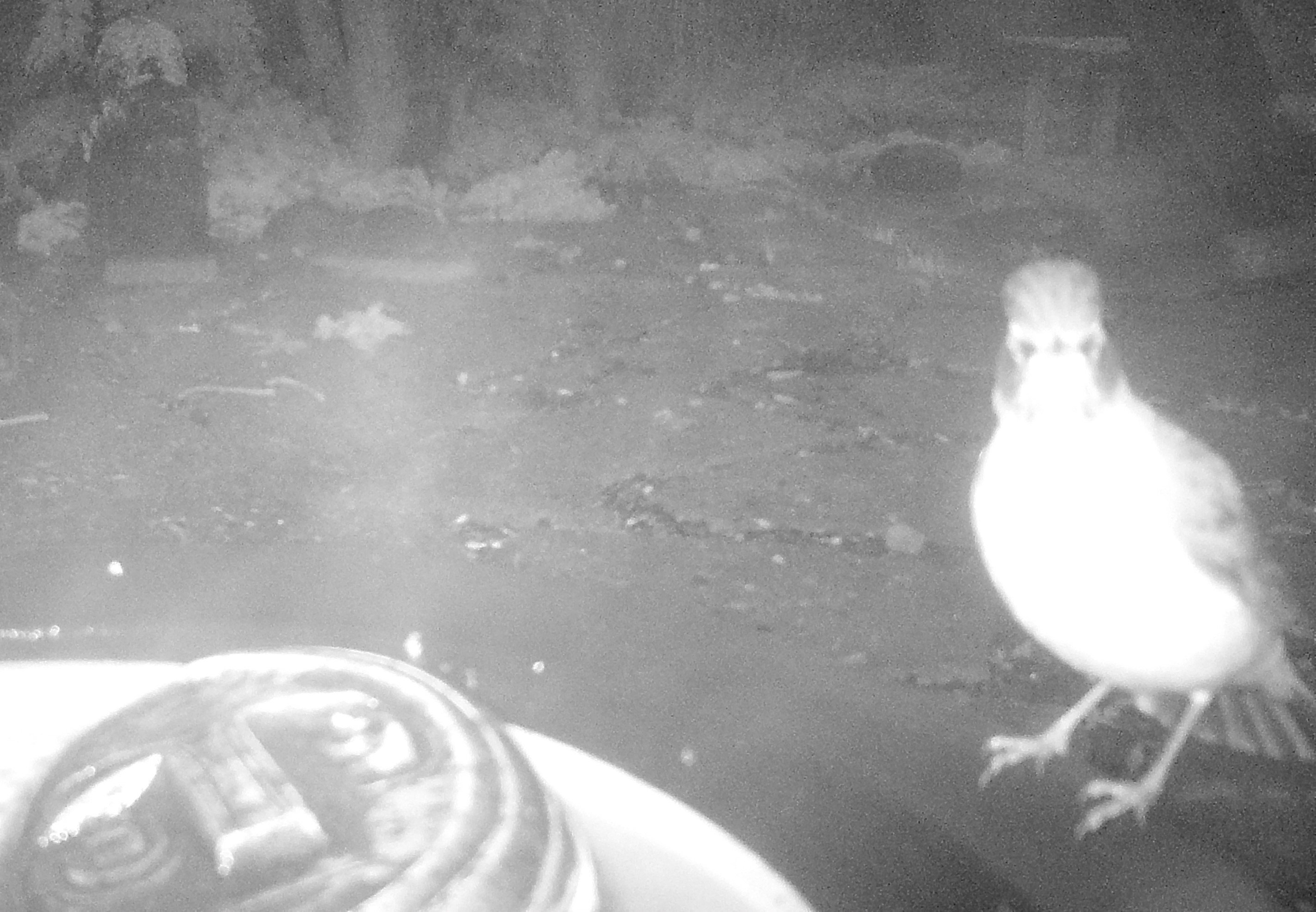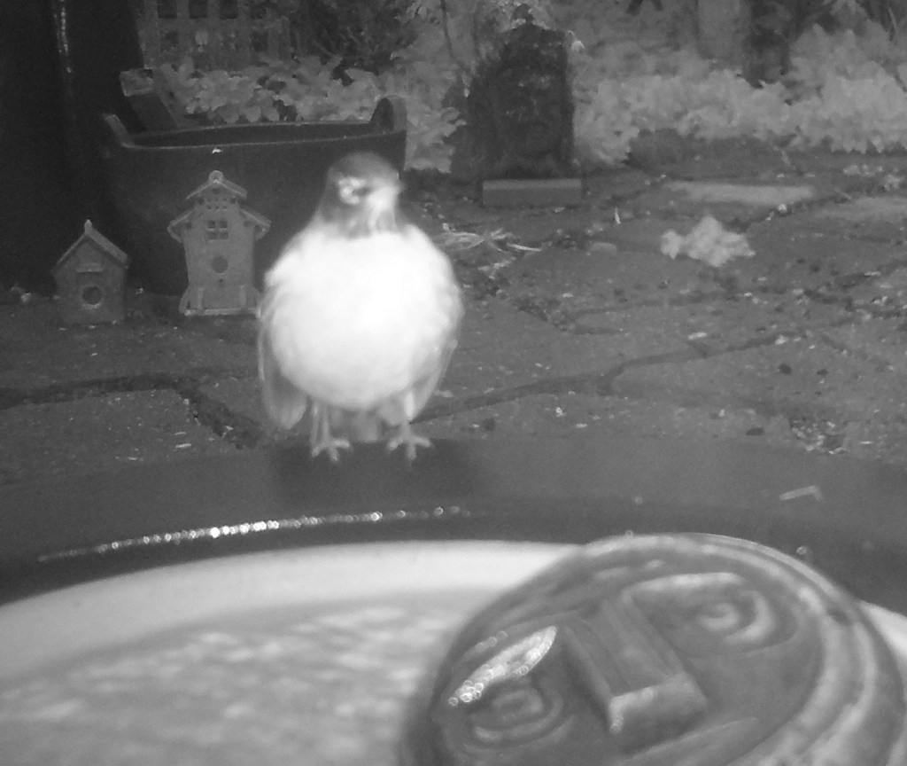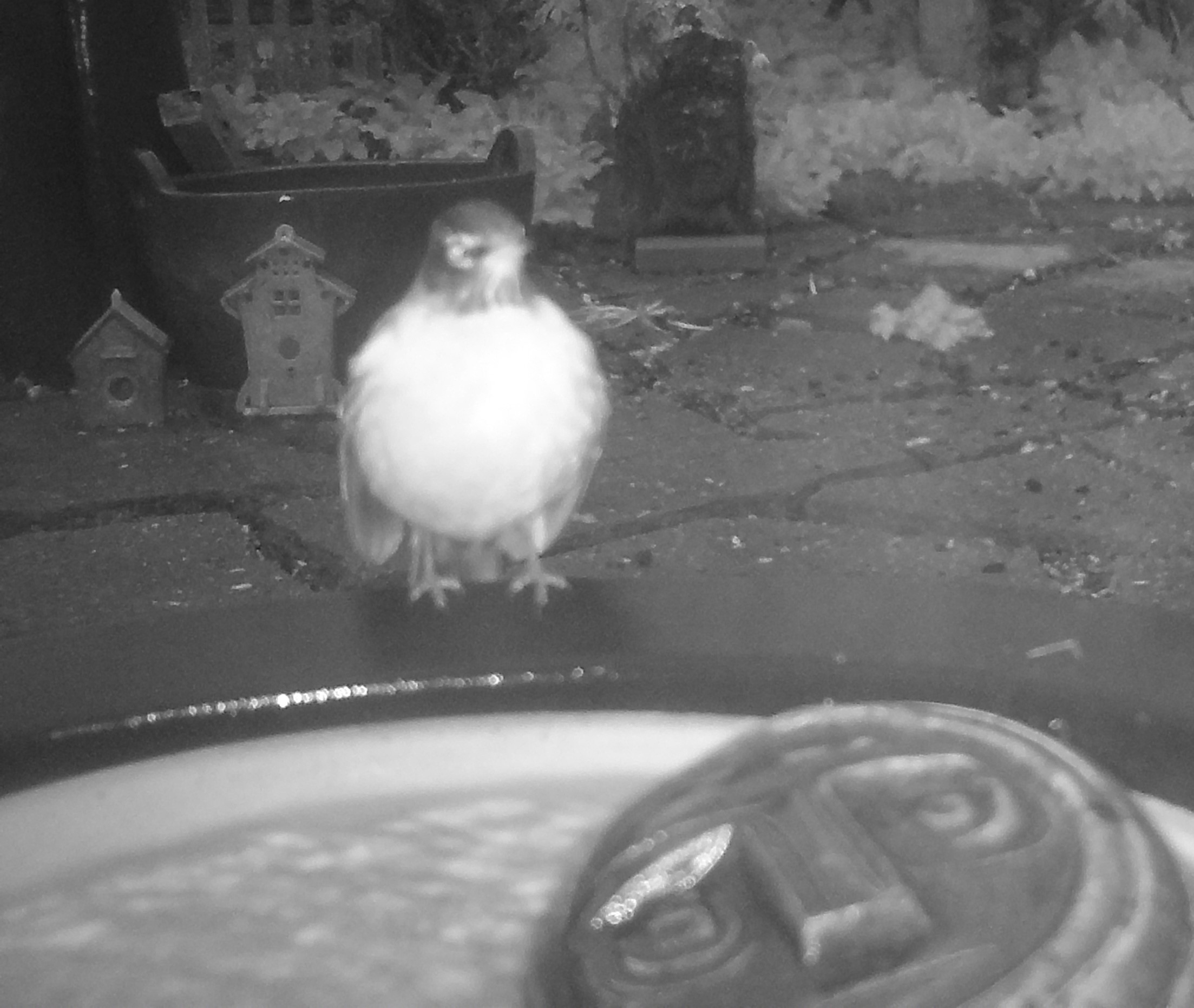 Looking more like an X-ray image rather than an early bird out for worms in the Foggy Bottoms Resort and Spa this Robin wanted talk with the Face of Everyman. Of course, the venerable sage wanted to sleep till dawn.
