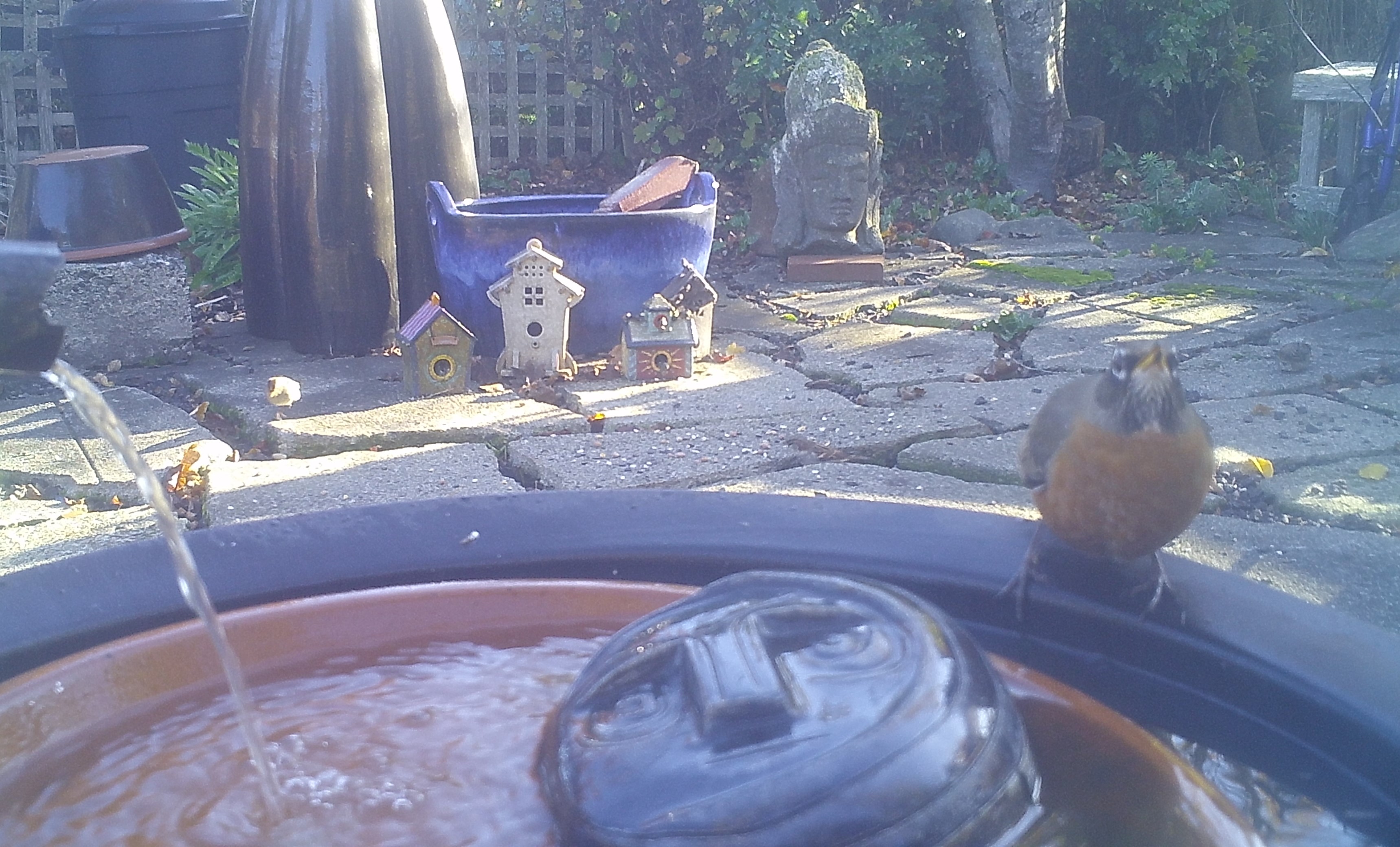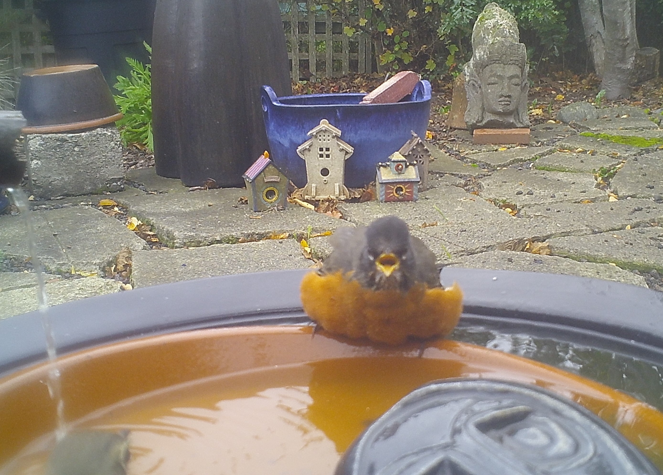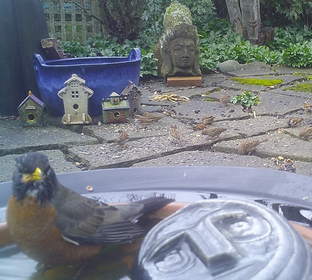 Looking more like an X-ray image rather than an early bird out for worms in the Foggy Bottoms Resort and Spa this Robin wanted talk with the Face of Everyman. Of course, the venerable sage wanted to sleep till dawn.