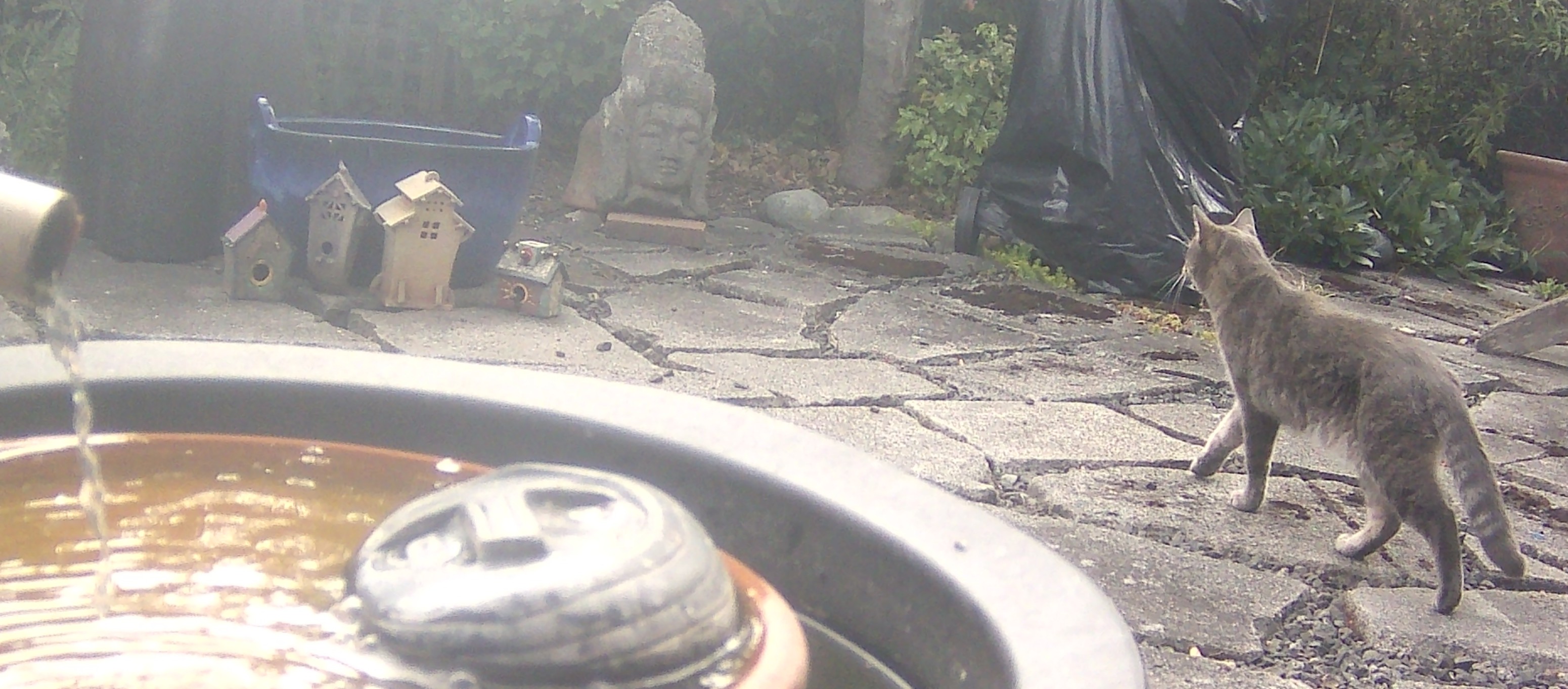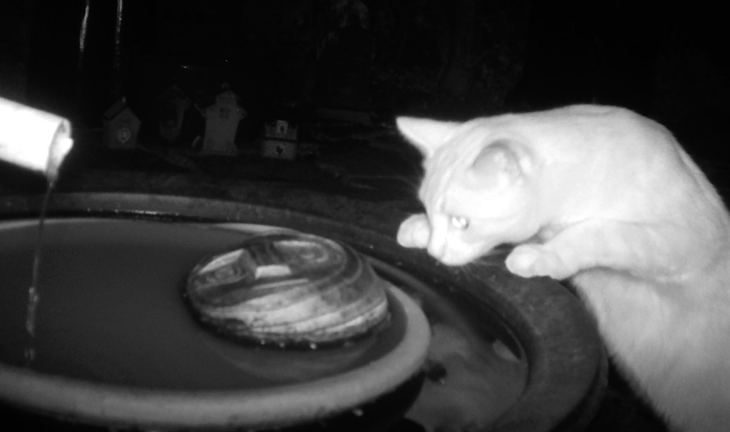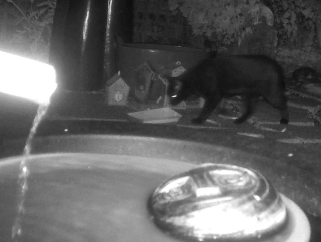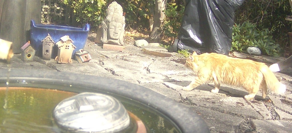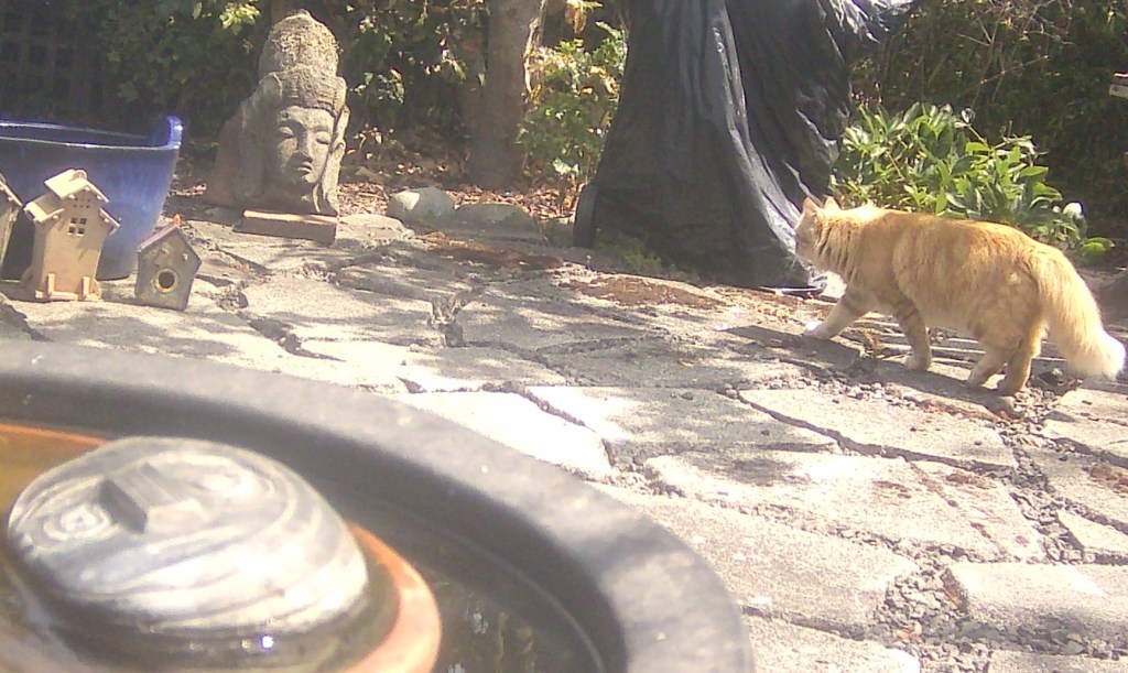 Not-Our-Cat as seen traipsing thru the Foggy Bottoms Resort and Spa after a successful night of evading coyotes. the Face of Everyman had lost count of how many lives that cat had remaining.
