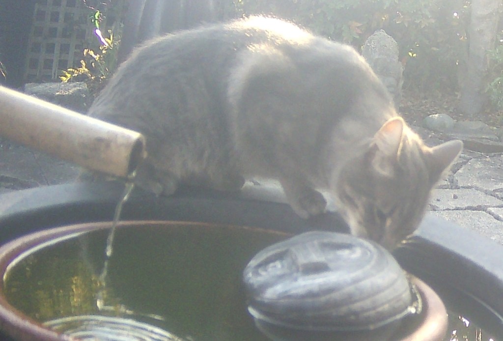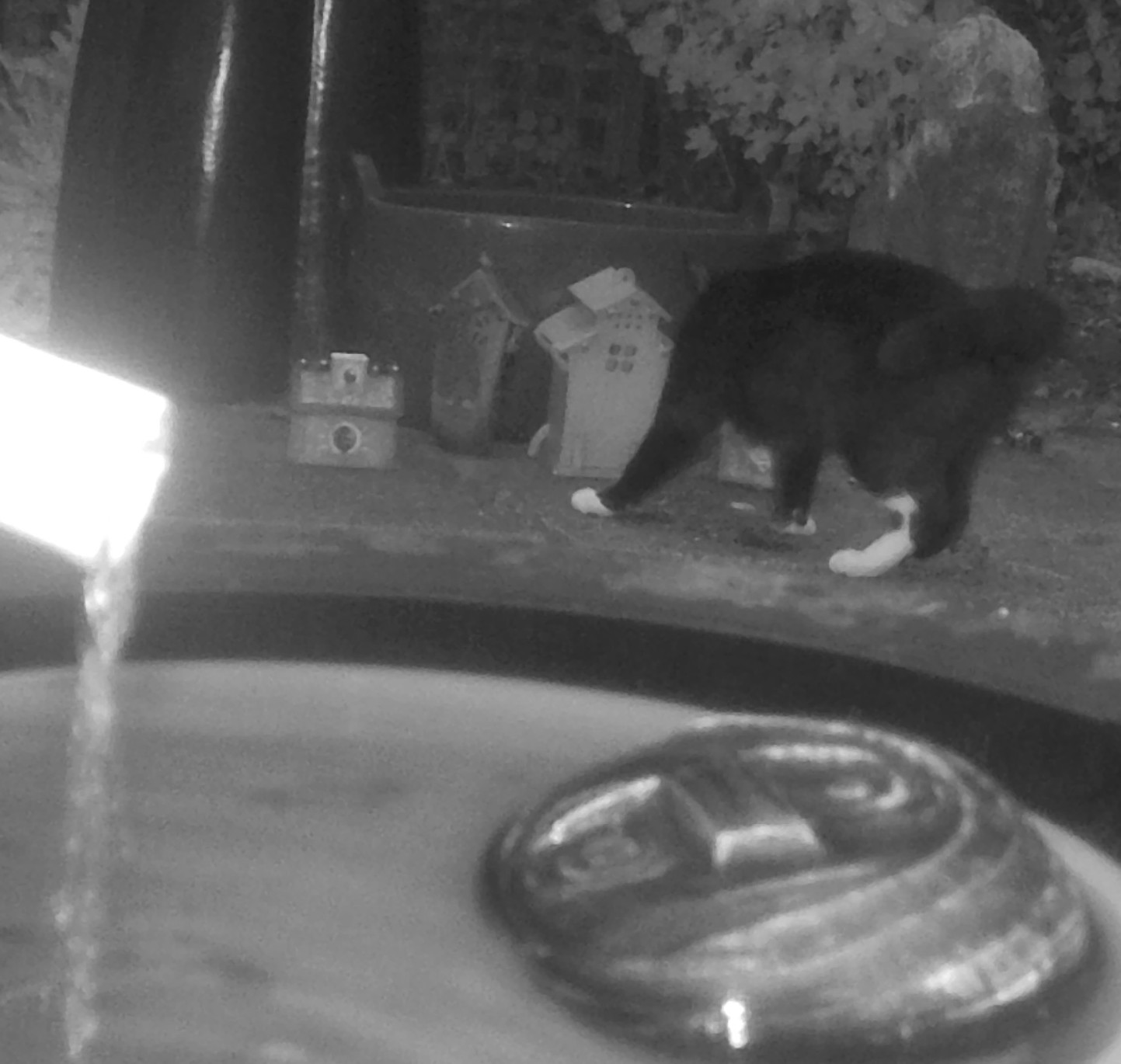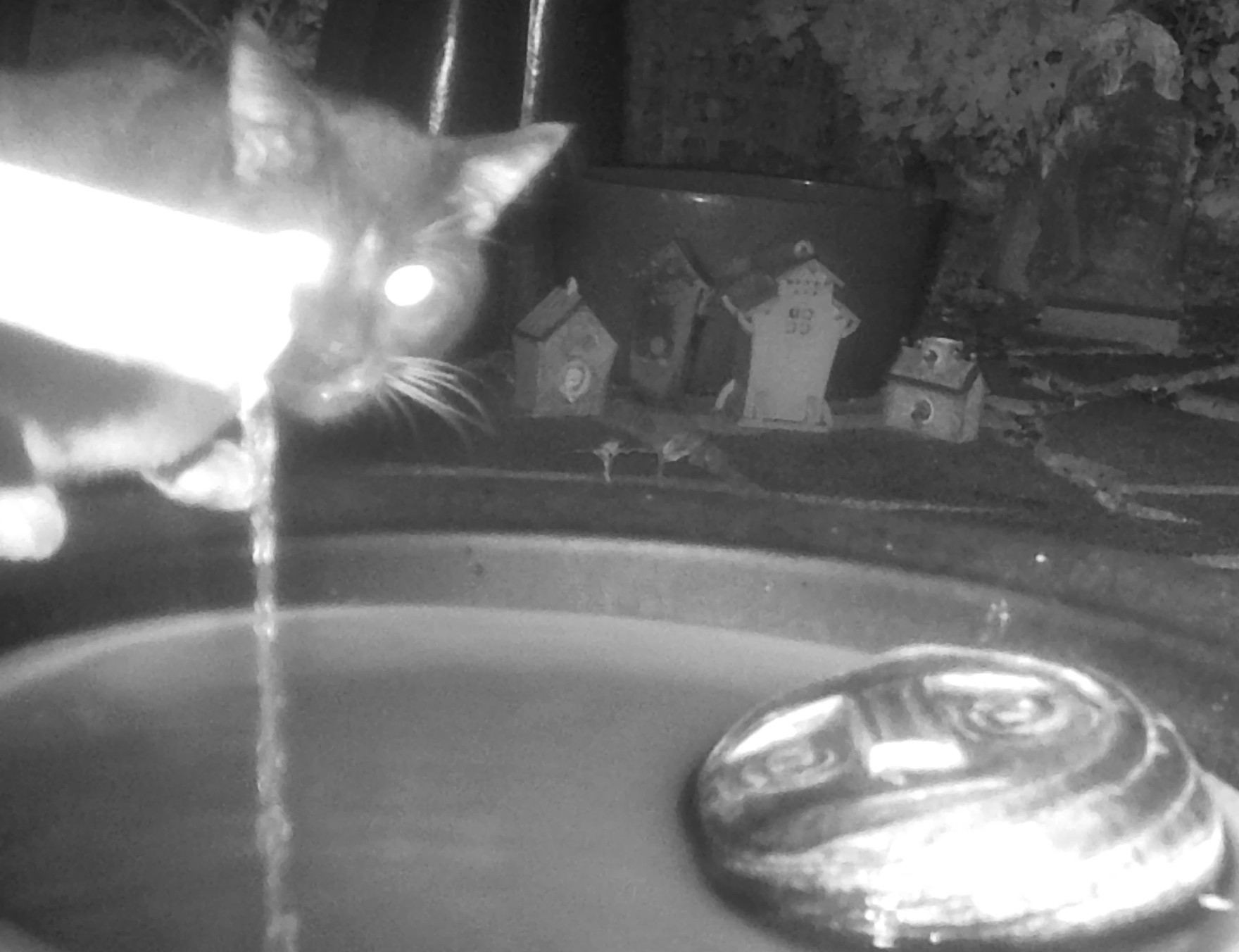 Not-Our-Cat as seen traipsing thru the Foggy Bottoms Resort and Spa after a successful night of evading coyotes. the Face of Everyman had lost count of how many lives that cat had remaining.