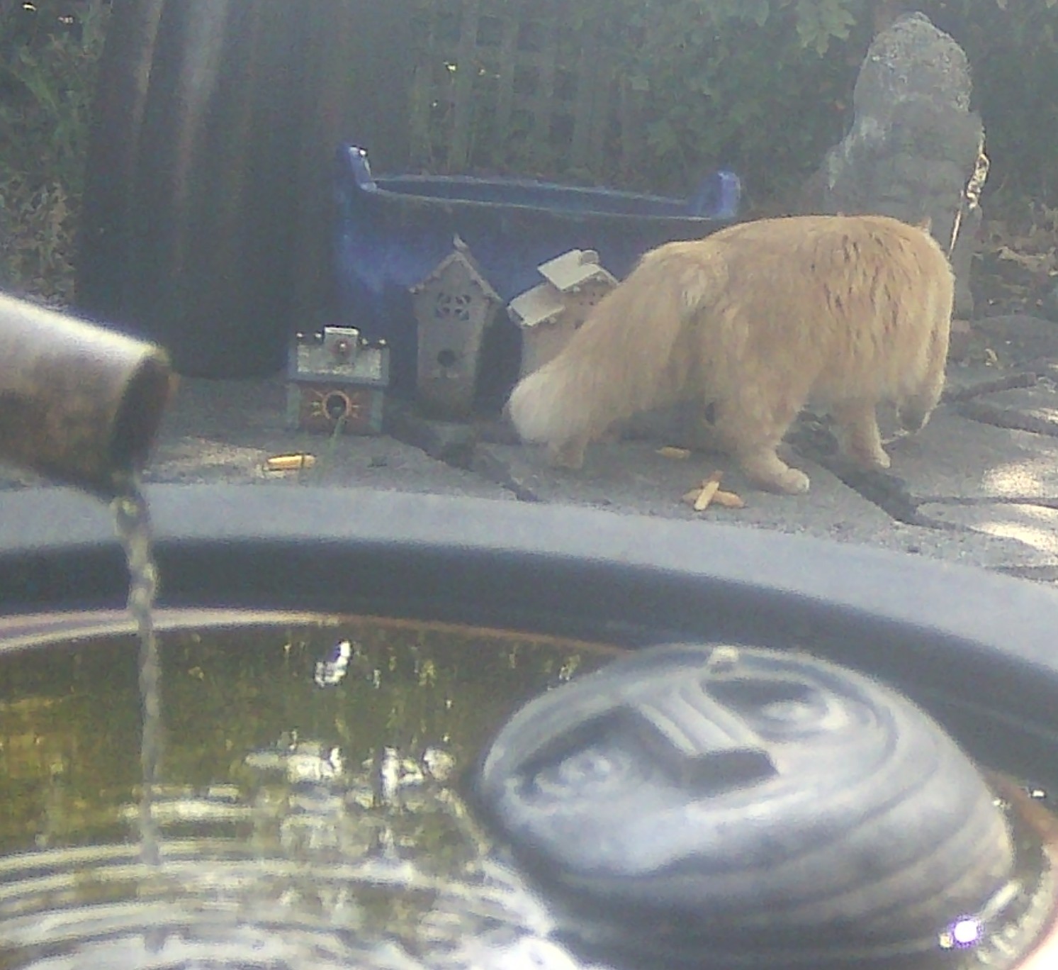 Ever wary of his vulnerability, Not-Our-Cat looks for would be assailants in the peaceful gardens of the Foggy Bottoms Resort and Spa. the Face of Everyman is alarmed by his very presence.