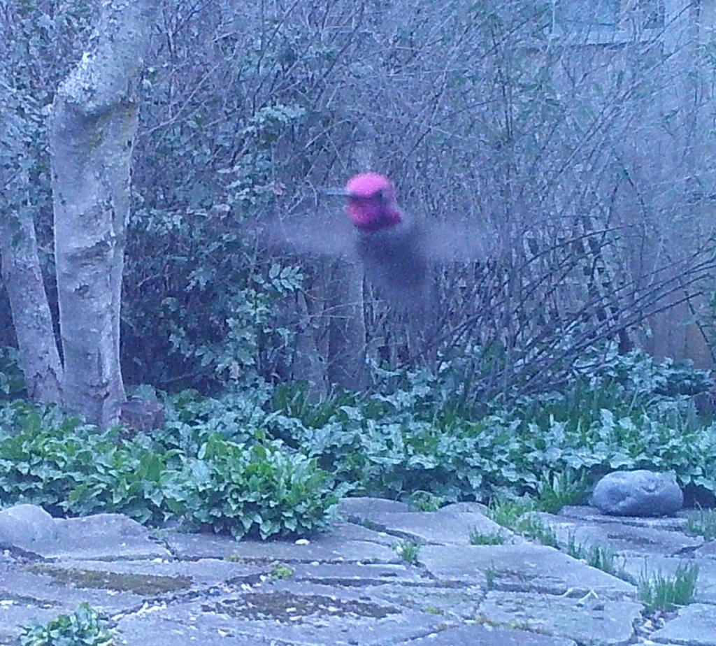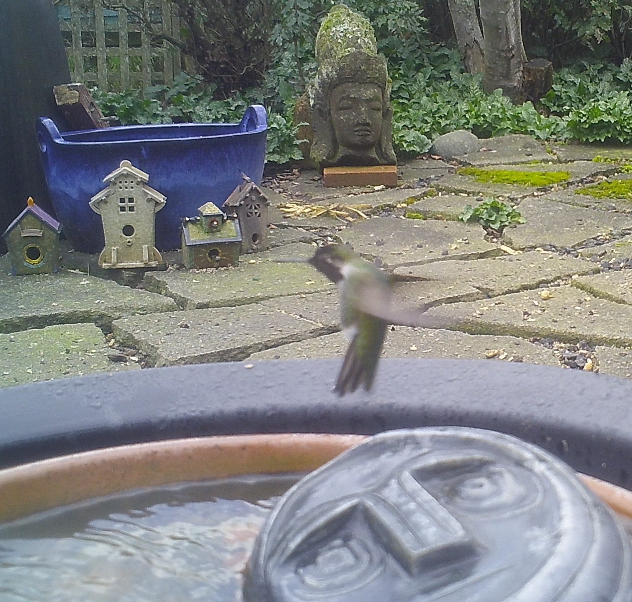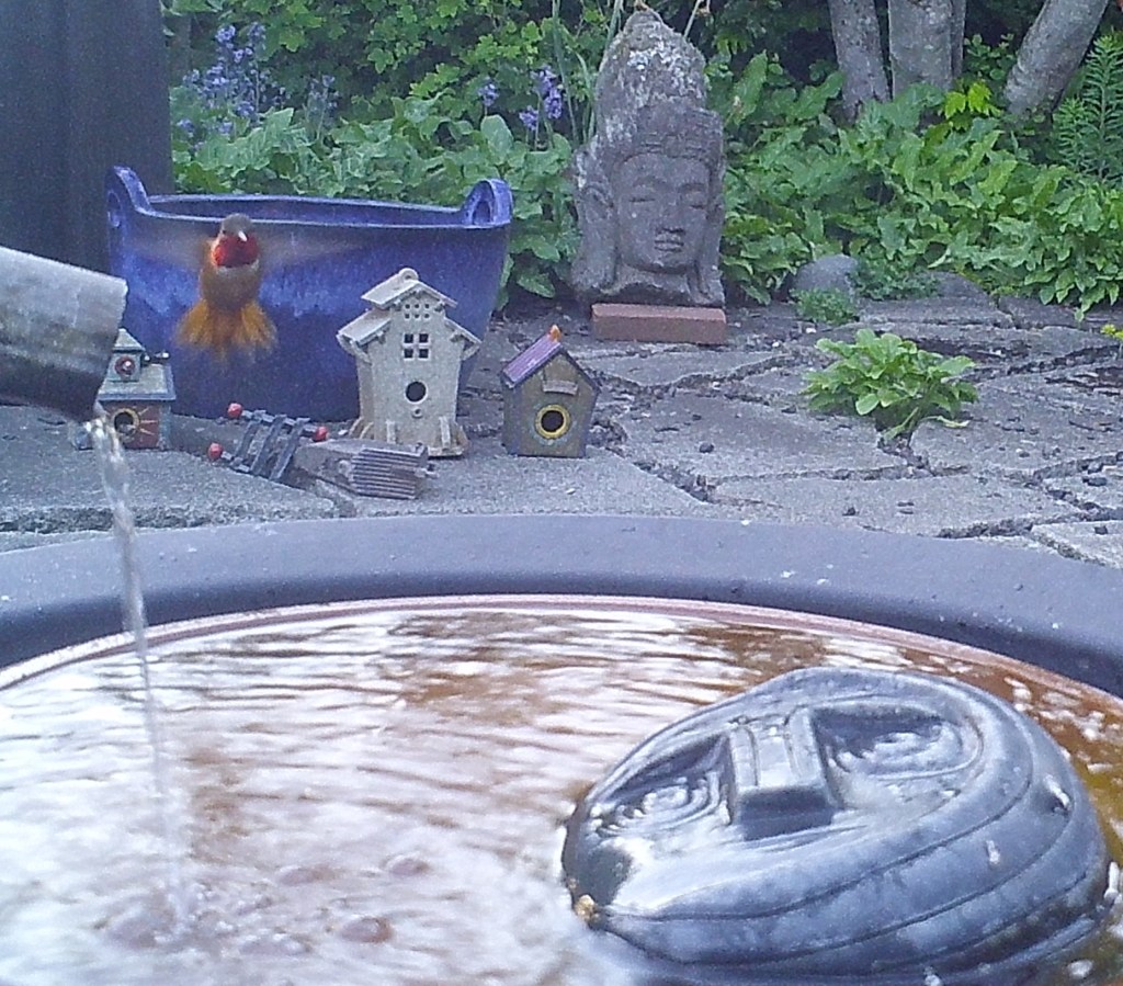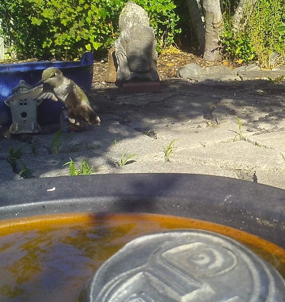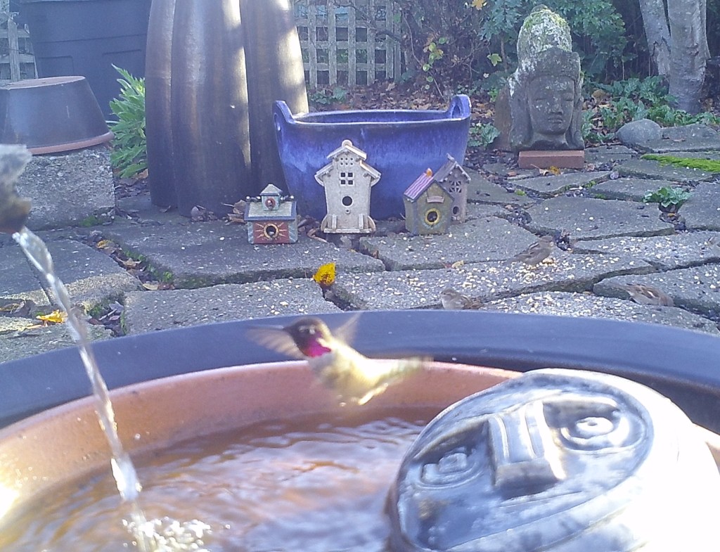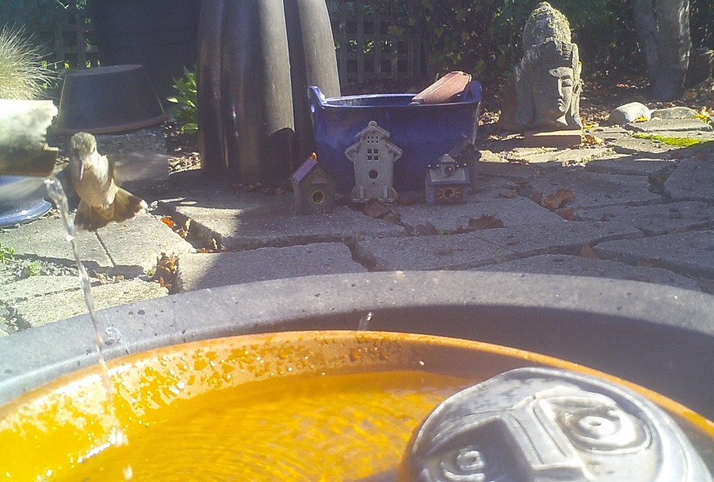 This Hummer mistakenly took the warm waters of the Foggy Bottoms Resort and Spa for a feeder. One swallow corrected that notion. He returned to a near-frozen feeder and forced himself to drink. the Face of Everyman applauded his actions.