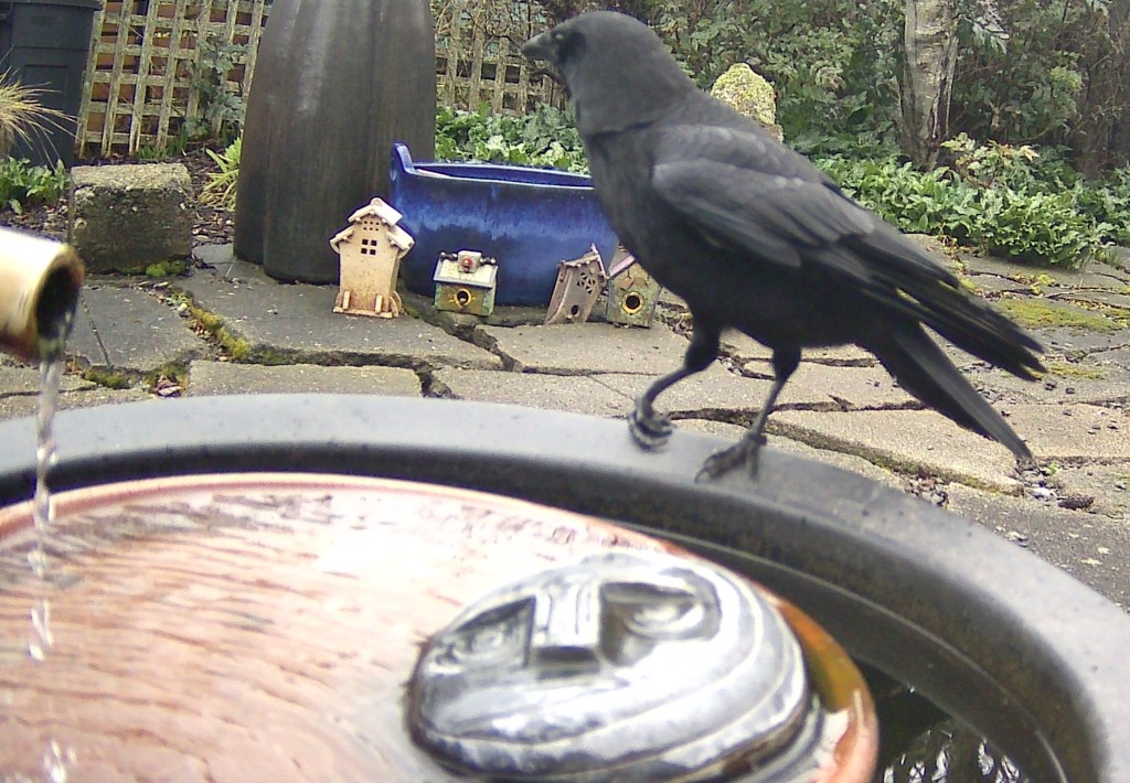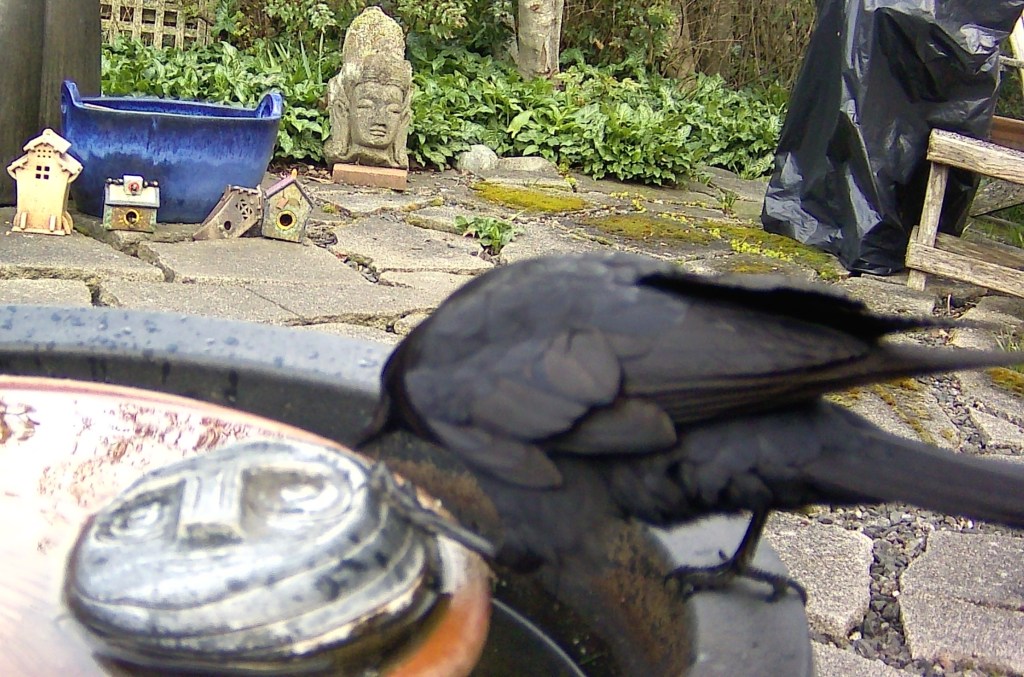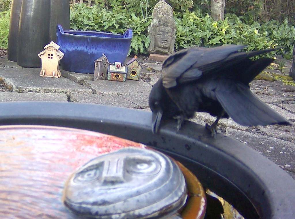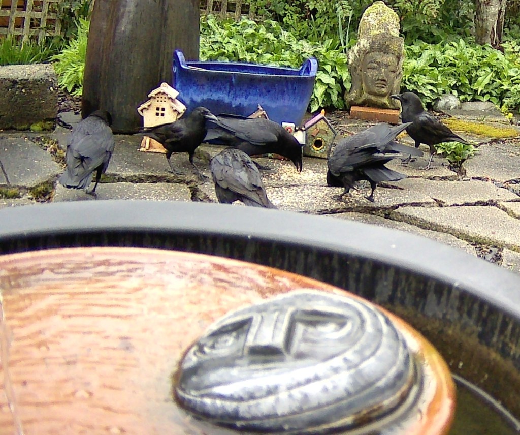 Morfran waits his turn as Bambi’s cousin Alvin devours the birdseed scattered in the Foggy Bottoms Resort and Spa. Once again, the Face of Everyman regretted his timing.