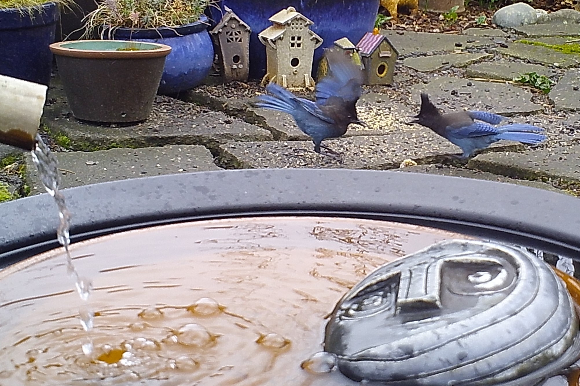 the Face of Everyman awoke from his nap to discover a veritable invasion of noisy Jays gleaning the choices morsels of holiday largess courtesy of the Foggy Bottoms Resort and Spa. He addressed them sharply; suggesting that they return to their mountain top conifers.